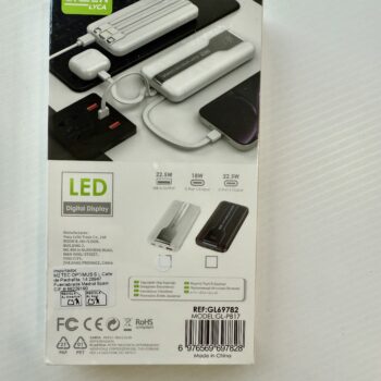 Batería externa Power Bank de 10000mAh con carga rápida de 22.5W. – Capacidad: 10000 mAh – Potencia de carga: 22.5W – Incluye cables integrados para carga. – Indicador de carga digital.