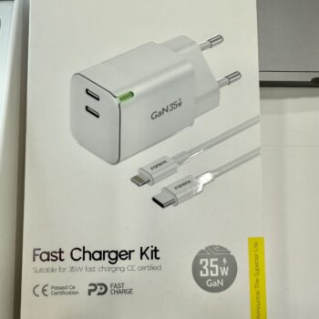 Kit de cargador rápido Foneng con tecnología GaN. Incluye un adaptador de corriente y cables. – Potencia de 35W. – Doble puerto Type-C. – Carga rápida. – Certificado CE. – Incluye cable Type-C a Lightning y cable Type-C a Type-C.