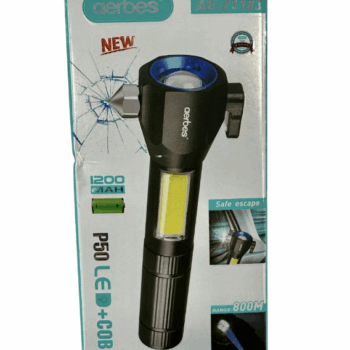 Linterna multifunción Aerbes con diseño robusto y práctico. – Modelo: AB-Z1183 – Potencia: P50 LED + COB – Batería: 1200 MAH – Alcance: 800M – Incluye martillo de seguridad para escape. – Diseño compacto y portátil.